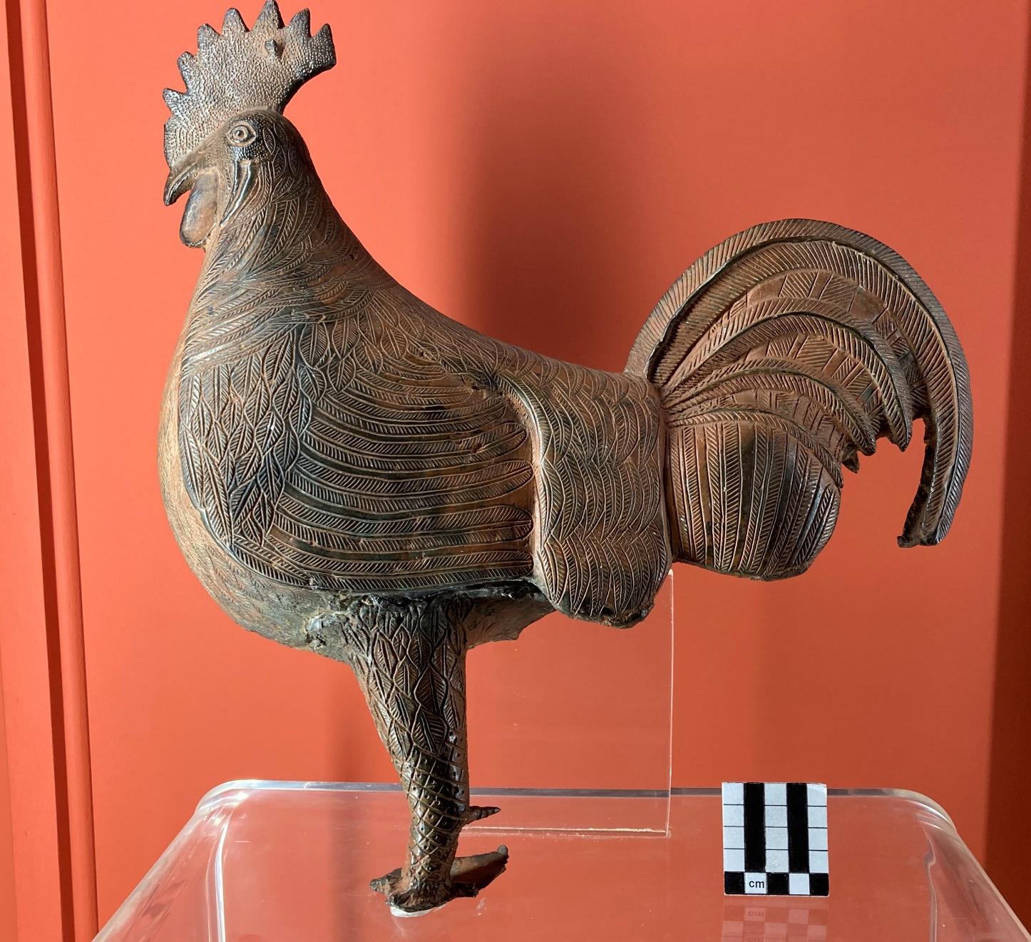 She represents the queen mother Iyoba. High dignitary of the kingdom and mother of the future Oba (king). Iyoba is compared to a rooster for her role as head of the Oba’s harem. You can give orders to the other wives. These roosters are placed on the altar of the Oba’s ancestors and his birth mother. Bronze [latão] is the metal reserved for the royal family.