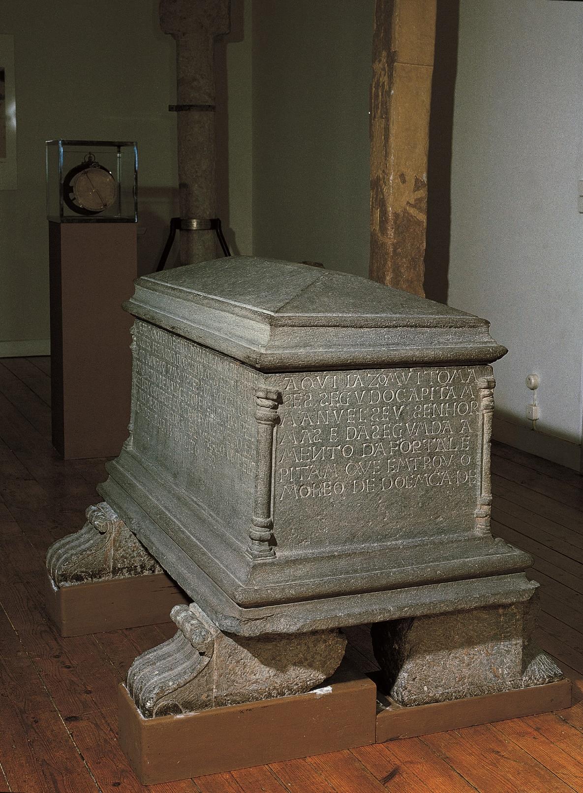 Urn where the bones of Afonso de Albuquerque (c. 1452-1515), governor of the Estado da Índia between 1509 and 1515, are said to have been deposited. Quadrangular funerary box with lid resting on four supports, two decorated with a volute and two with a lion’s head (?). The angles of the box are closed with columns. Epitaph on four faces alluding to the deeds of Afonso de Albuquerque in India. The coat of arms has been obliterated. In 1565 his remains were sent to Lisbon. In 1896 the urn was sent from Goa and given to the Lisbon Geographical Society.